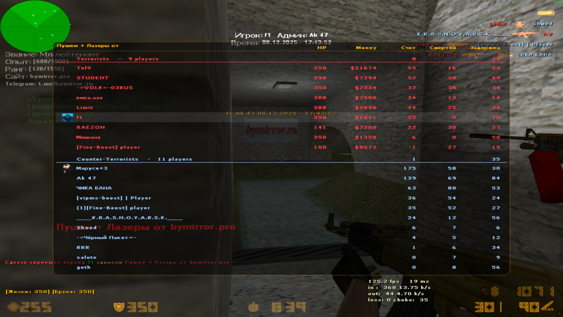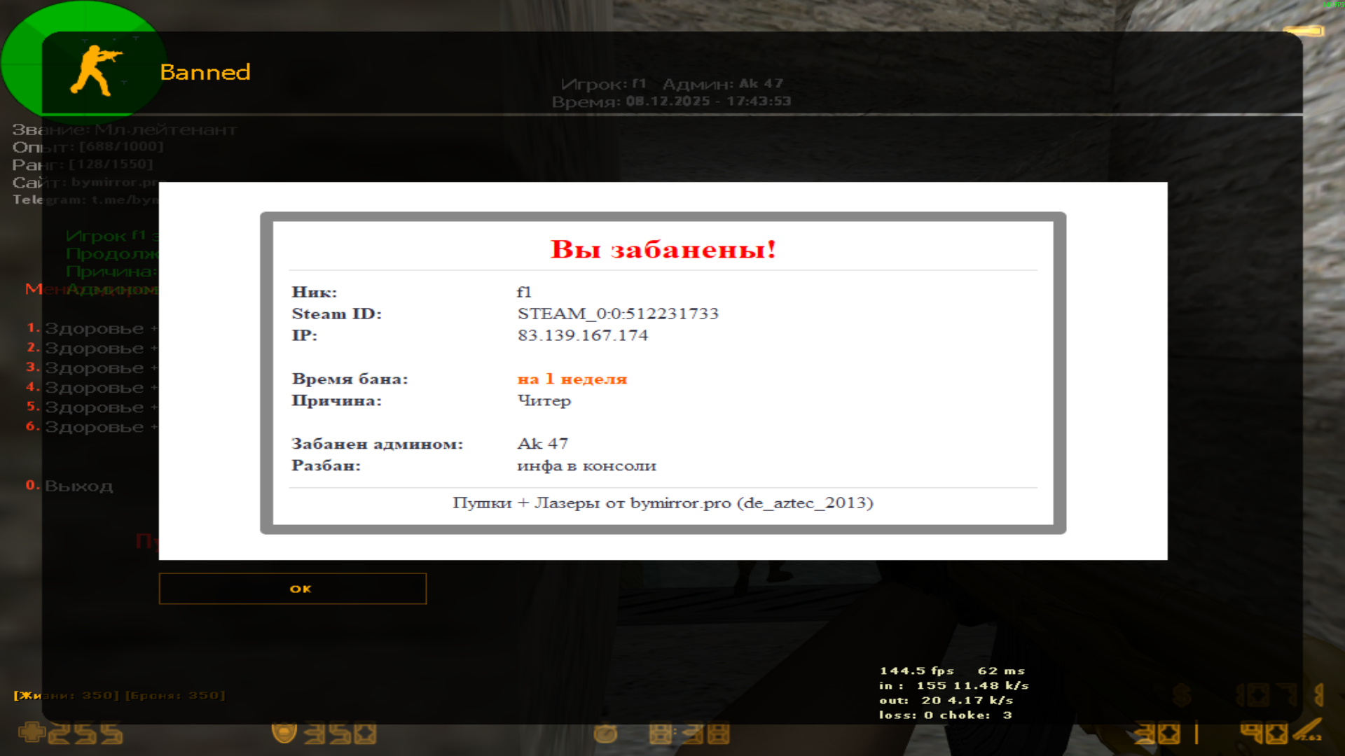 Данный админ даже не захотел заходить в спектра чтоб последить за мной. Стоило пару раз вынести его, подгорело и выдал бан... На скриншоте и на демке видно, специально прожимал TAB чтоб убедиться в том, что, бан был необоснован и без слежки :)