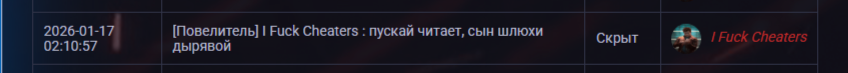 Как я уже говорил в видео, он какой то дефиктивный подросток, который не умеет нормально общать и вот такое для него норма, видя как он пытаеться писать бред про меня и читы, хочеться ему скать, что на некоторых крупных проектах, за подобное банят навсегда и без права какого то разбана (то есть купить за деньги) это к тому, что подобные "люди" просто мусор, намного хуже чем читеры, а учитывая, что он еще играет с прицелом на авп, что на данном проекте приравниваеться к читам, так он еще и читер...